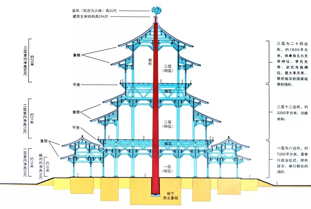 据史料记载,明堂有三层,高度在90米左右,中有通天柱上下贯通。而天堂有五层,从第三层就可以俯瞰明堂,这样算来,高度至少在150米。天堂中还放有一尊大佛,仅佛像的小指就可容纳数十人。