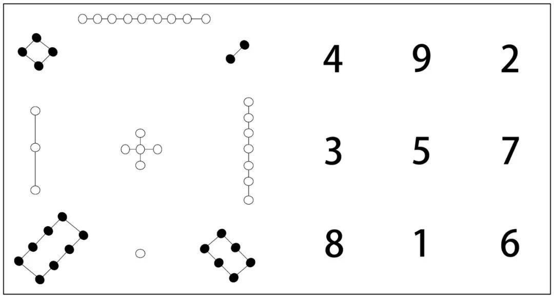以洛书为例,将圆点换成数字,得到这样一个排列: