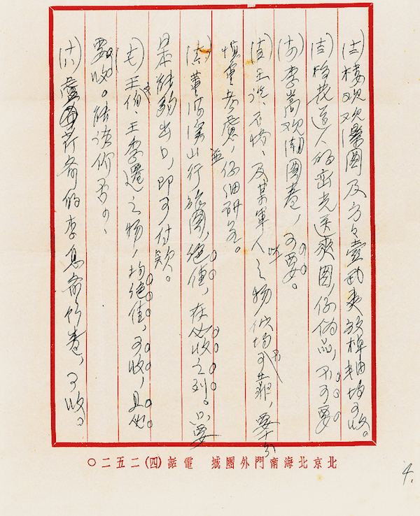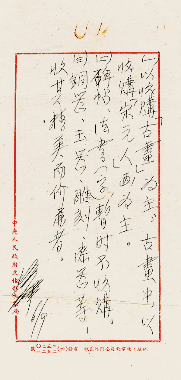 第一重要的是:先购董源的溪山行旅图轴。凡从日本来的东西,都应收。这是十分必要的。其次,凡有被美帝垂涎欲购之可能的,也必须先收。像李唐伯夷叔齐卷等,应先收。