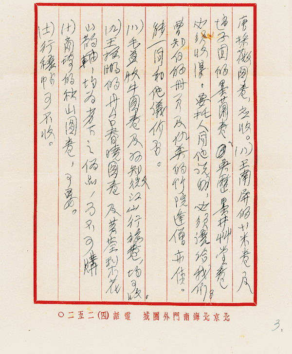 先生奔走沪穗,为人民得到了“二希”,诚旷古之盛举也。香港方面,名绘法书尚多,当徐徐图之。闻张大千曾登报欲售去“潇湘”(按:即董源《潇湘图》),与伯郊兄商酌,拟请其即日赴港,办理此事。若能与顾闳中一卷(按:即《韩熙载夜宴图》)并得之,则“五代宋初”之画,可得而论之矣。