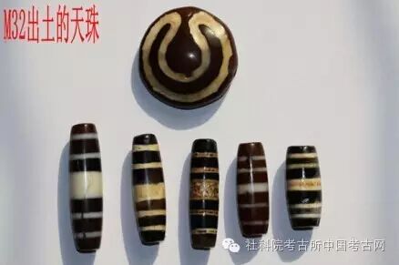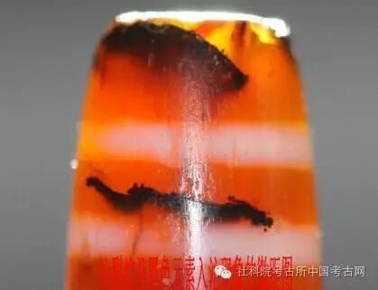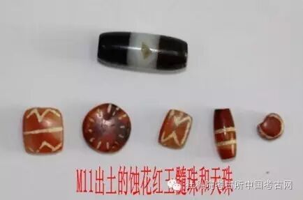 (图二十一)M11 出土的 5颗蚀花红玉髓珠和1颗天珠,我们可以看到每一颗珠子都包裹着亮润的包浆,珠体中部的白色蚀花部位有一个明显的水晶伴生体,透光能看到数层隐约的纹带状结构环绕着水晶伴生体。
