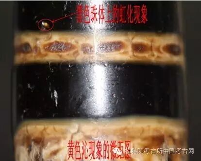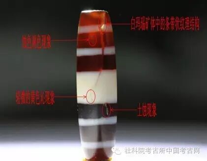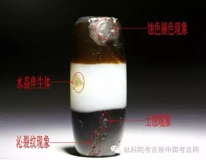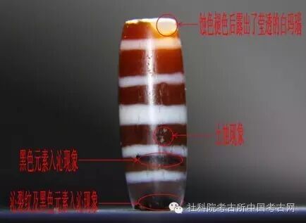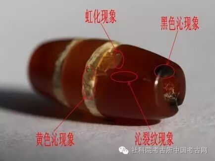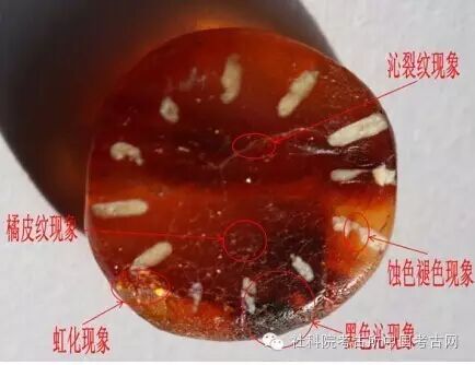 (图二十四、二十五)中的蚀花红玉髓珠上都有程度不一的各种受沁现象,这些受沁现象包括:包浆现象、橘皮纹现象、黄色和黑色致色元素的入沁现象、沁裂纹现象、虹化现象、土蚀现象、蚀色褪色现象、内风化现象等。