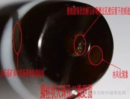 (图二)是圆柱状天珠钻孔的不同角度的微距图,从中可见游离状的解玉砂琢磨过孔壁后留下的痕迹以及内风化现象和隐含在珠体内的天然条带状结构。