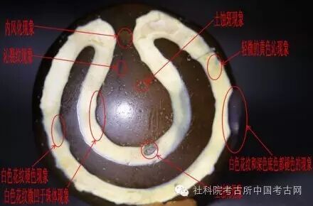 第6颗天珠 (图十九)整颗珠子的表面包裹着一层润泽的包浆,珠体上有黄色沁、大小不一的土蚀、蚀色褪色以及小沁裂纹等现象。天珠的珠体上有变白失透现象,其表现为本应是半透明的玛瑙珠体逐渐变白且透明度也趋于降低,这种现象并非质的改变,而是源自墓群台地棕漠土中强碱的作用。另外,在珠子的蚀花过程中,有低温短时间的加热过程,当温度相对较高或时间稍长也同样会使玛瑙珠体的颜色逐渐变白、透明度逐渐下降,变白失透现象现象具有递增或递减的特征。