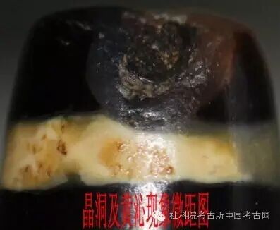 如(图二十)所示,这颗天珠的玛瑙珠体上有一处小的水晶伴生体。在一系列的受沁过程中,珠体上水晶部分包含的杂质被水解带出,也有一些壤液中富含的致色离子渗透胶结在晶体间的微孔隙当中,逐渐形成了我们看到的珠体上的伴生水晶部位的受沁状态。