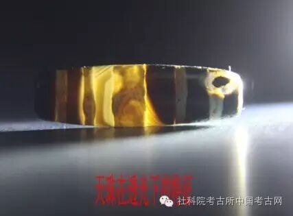 (图五)这颗天珠的整个珠体都有一层包浆包裹。高古玉的研究者认为“包浆”现象是由于珠、玉长期埋藏于地下,因受沁而形成了非晶化(玻璃化),因此产生了类似玻璃的莹亮光泽。这批珠子表层莹亮的包浆,是它们在2500年的埋藏过程中受沁的结果之一。