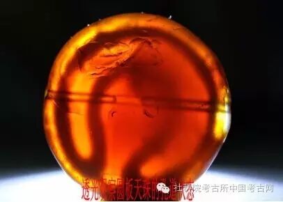第2颗天珠 (图十一)透光观察,玛瑙珠体上有一条明显的迥异于其它部位的透明条带状结构,这是玛瑙天然的条带状结构,古人蚀绘的黑、白两色在这条带状结构部位几乎消褪殆尽。另外,图中可以清楚看到这颗天珠还有土蚀现象、蚀色褪色现象和轻微的黄沁现象。
