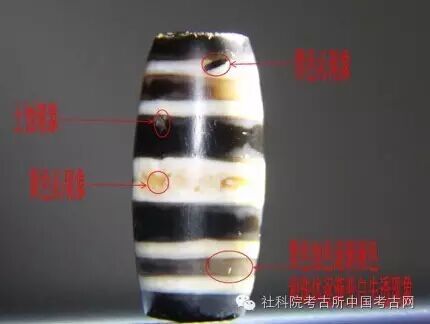 我们可以通过观察吉尔赞喀勒墓葬群出土的天珠来了解古代蚀花工艺呈现给我们的天珠特征,再结合前文中关于玉髓(玛瑙)染色的原理等因素综合解析,就不难推导出天珠的染色蚀花工艺了。这些天珠虽然经过了2500年的埋藏,但表面都有莹润亮泽的半宝石光泽,珠体上黑色蚀染部分的质感与白色花纹部分的质感有些许不同。
