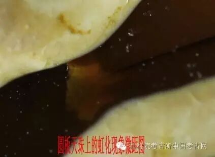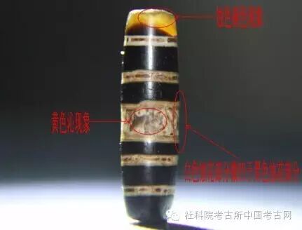 (图十八)珠子的白色蚀花图案上有色泽不一、或浓或淡的黄色入沁现象,是吉尔赞喀勒墓群的棕漠土中富含的铁元素被渗入胶结在珠体表层后形成的现象。当这种黄色沁呈现于天珠的白色纹饰上时,因为显色比较明显而较容易被观察到,但当这种色沁呈现在天珠的深色部位时,因为沁入颜色的色调和深色底色的颜色极为接近,从而宏观上与蚀花而成的深色部分很难做出明显的区别。
