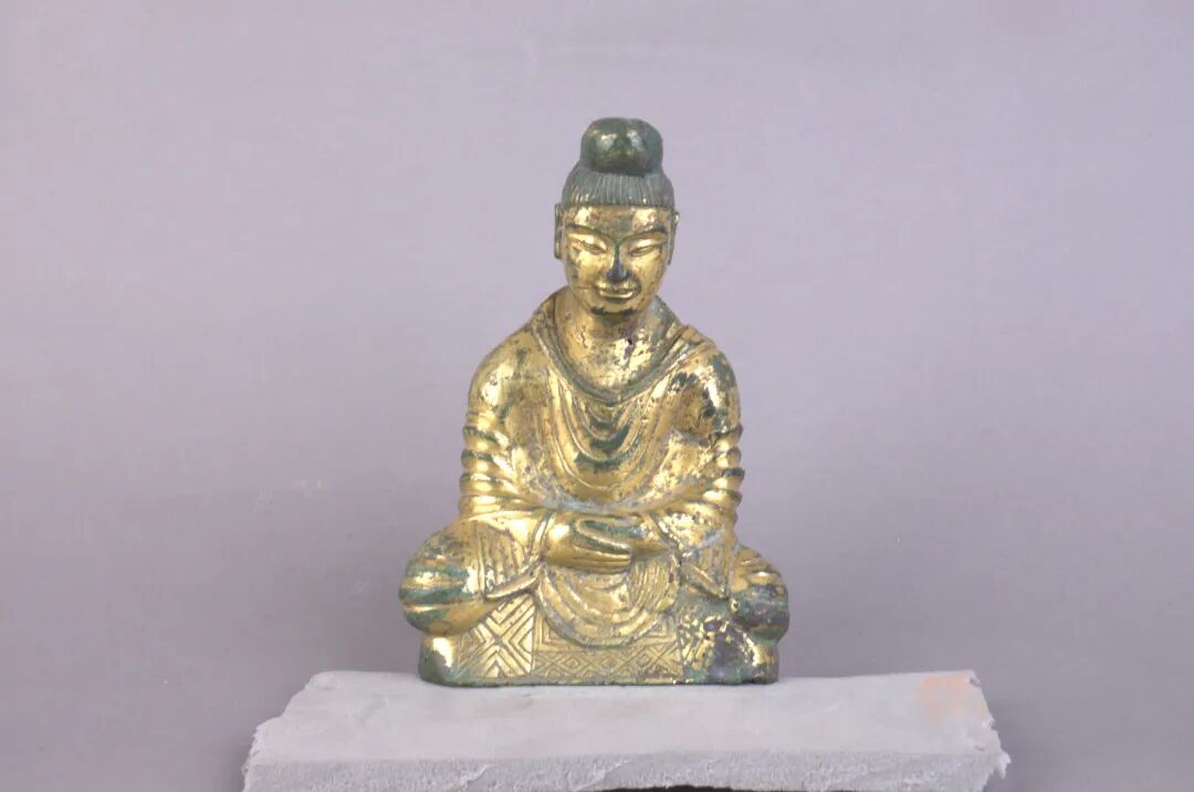 有这样一件十六国时期的文物,1979年长安县黄良公社石佛寺出土一件十六国时期的鎏金坐佛。佛陀呈现坐姿,面形方圆,广额,面带微笑。头顶束发,钵形肉髻,身着圆领通肩袈裟,胸口衣纹呈“U”形,纹理平直舒朗,断面呈现阶梯型,领带自右肩绕胸搭于左肩后,双手相叠,掌心向内,左手在里面,右手在外侧,双脚结跏趺坐。下有一前部为方形,后部为圆形的台座,装饰有几何纹和菱形纹。头后部有穿孔,可以安装背光,底座后部有刻画符号(文字),内容尚有疑问。