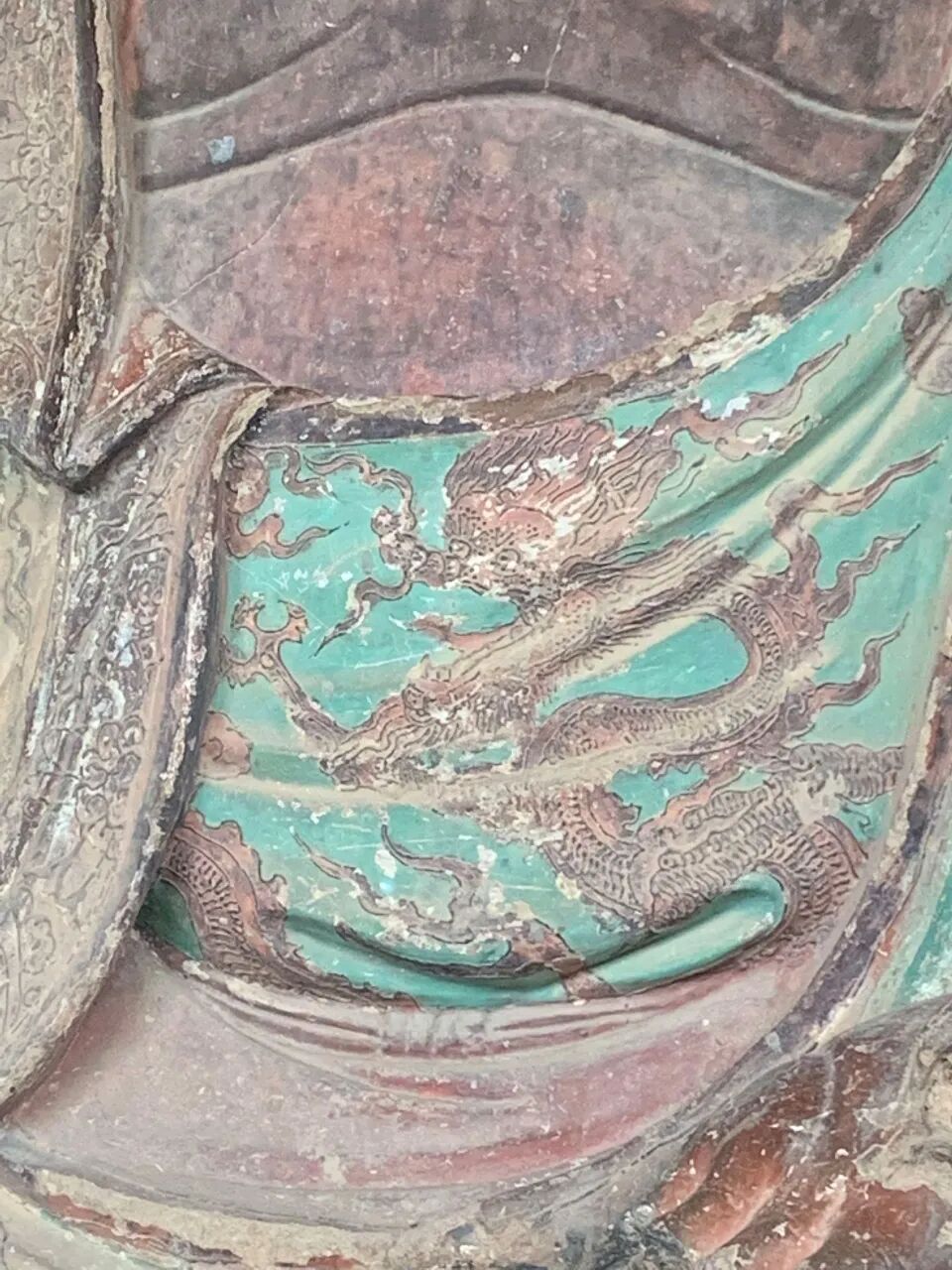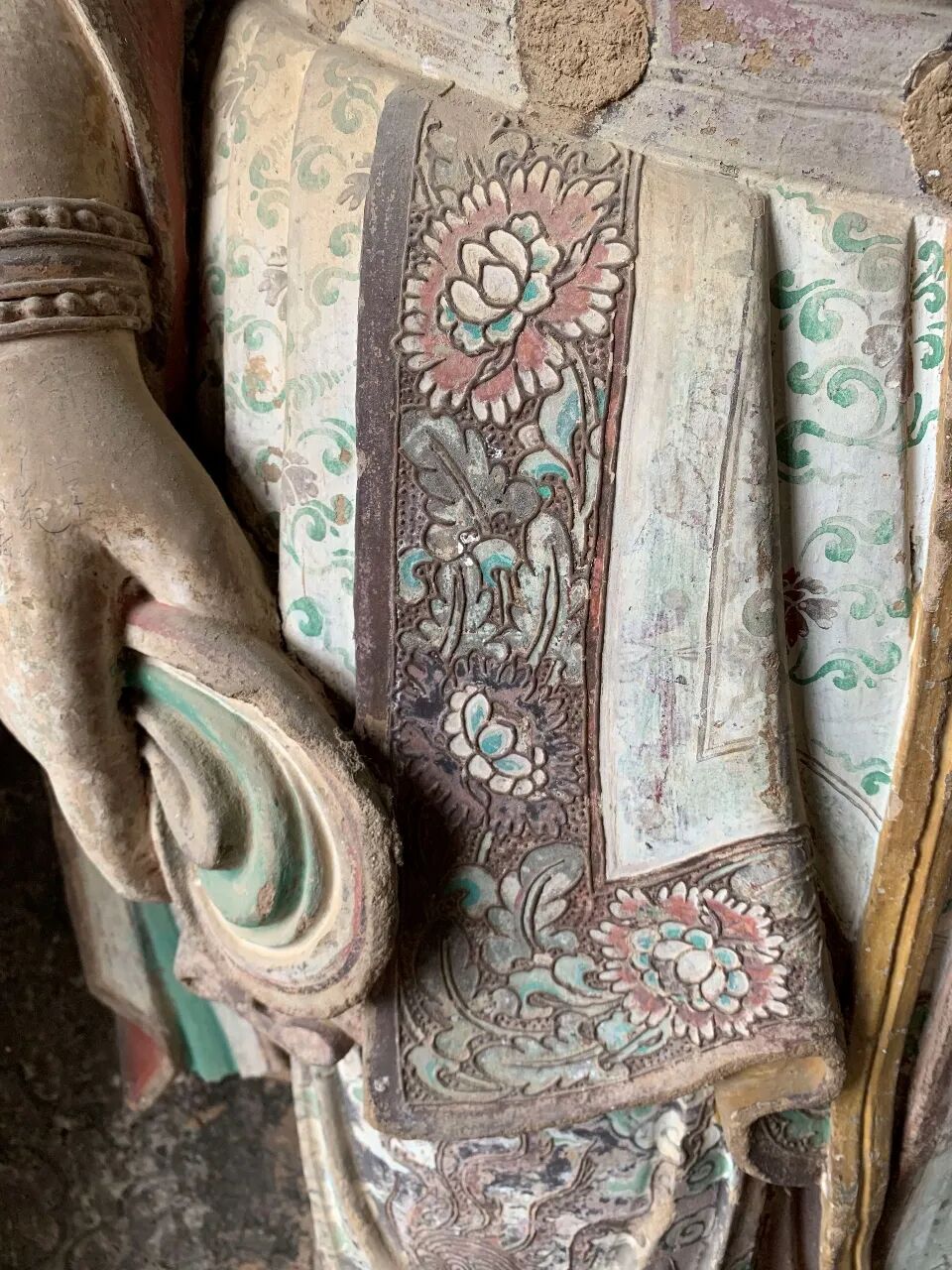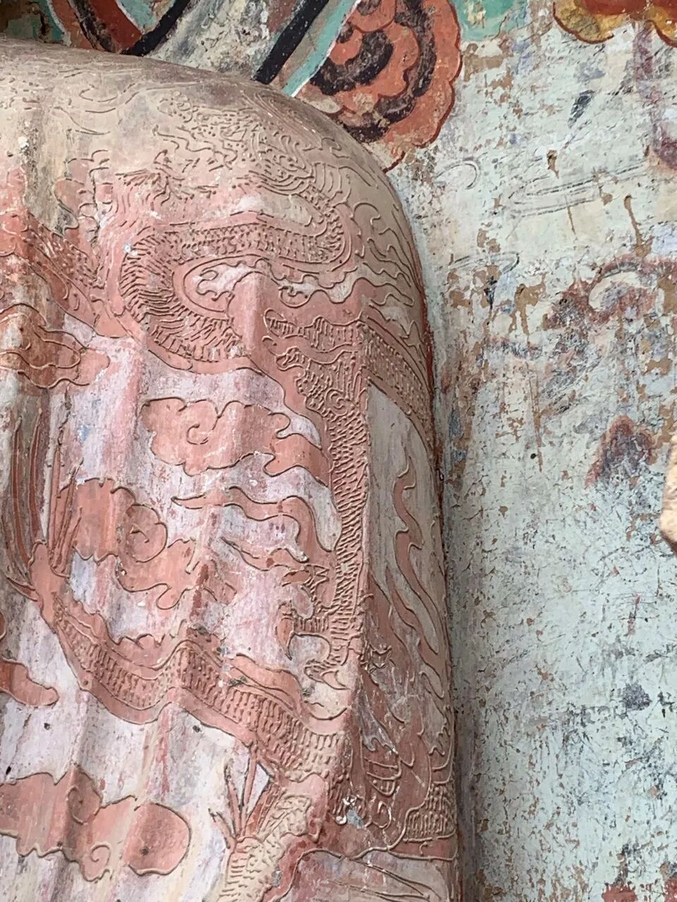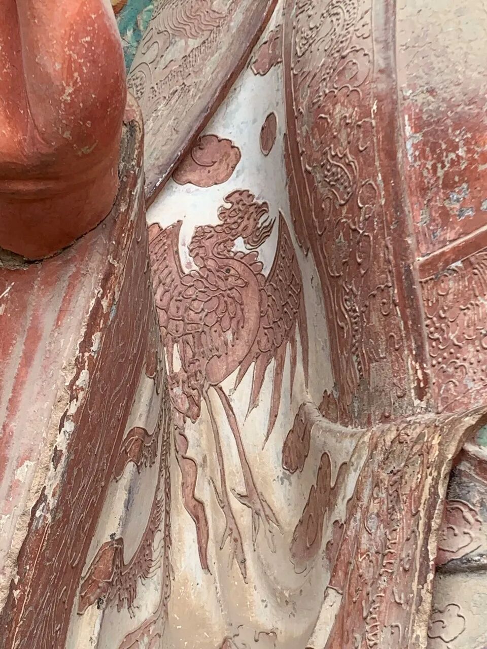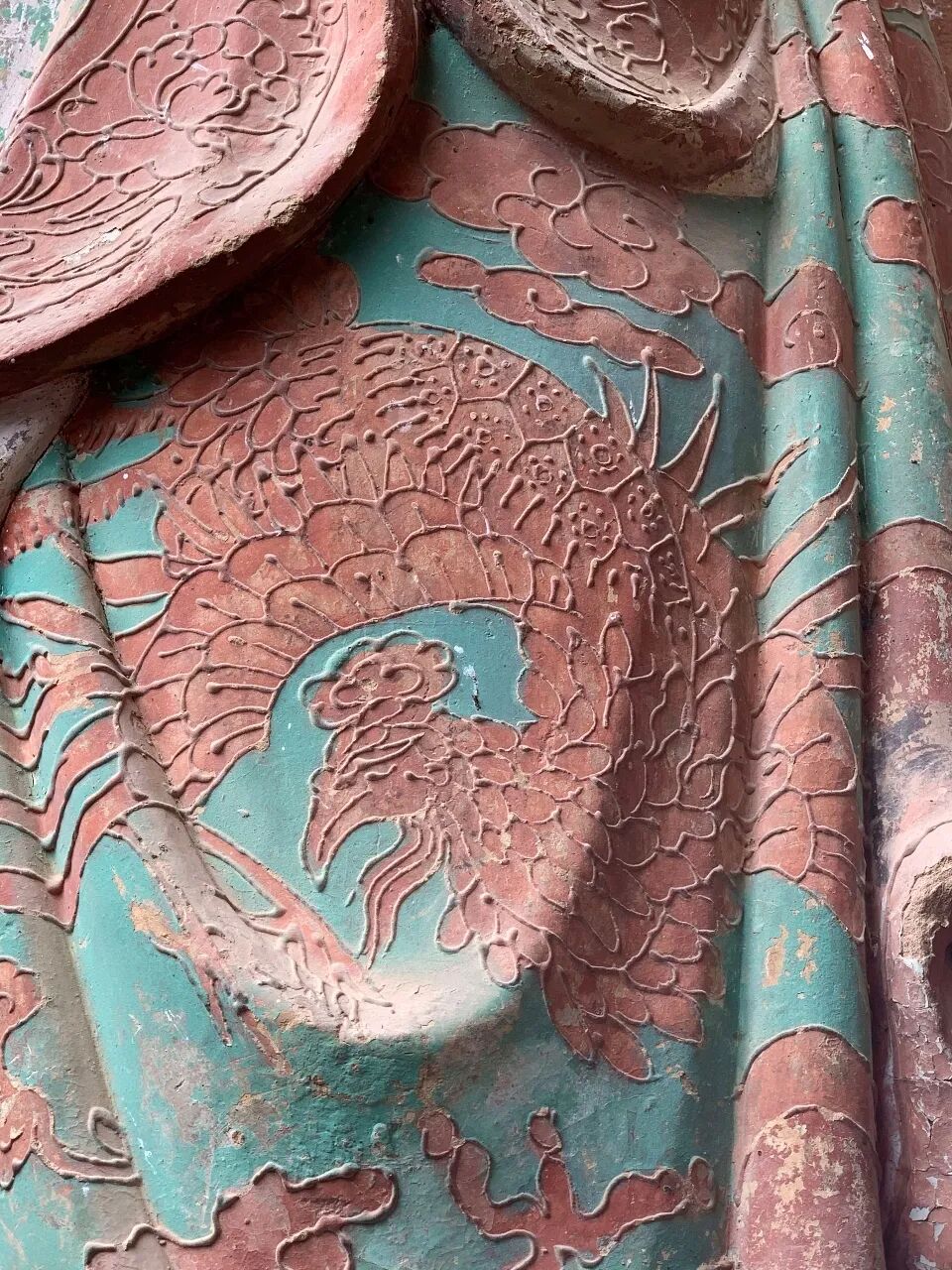 在明清时期信众用此法对塑像进行重新妆彩,普遍运用在塑像衣着上的龙、凤、花卉等各种图案,线条细密、流畅自如,装饰效果极强。