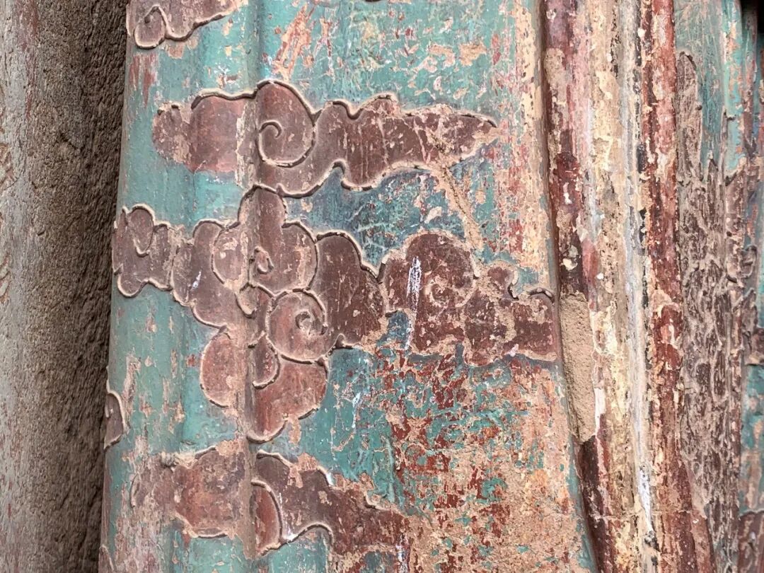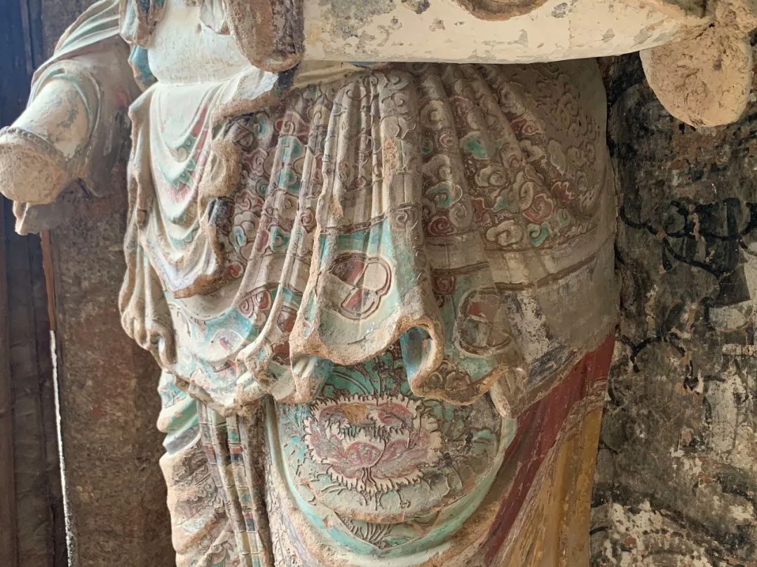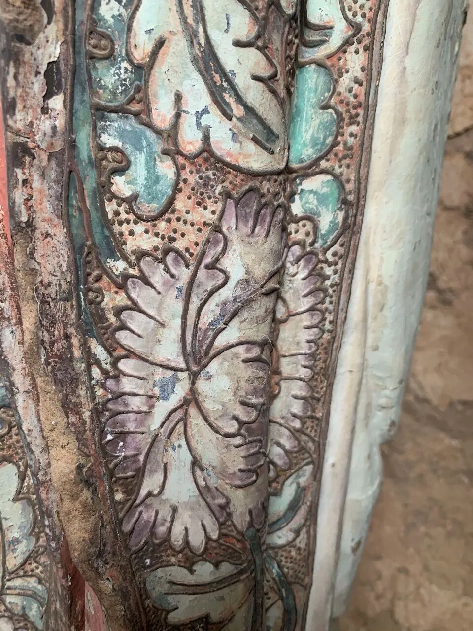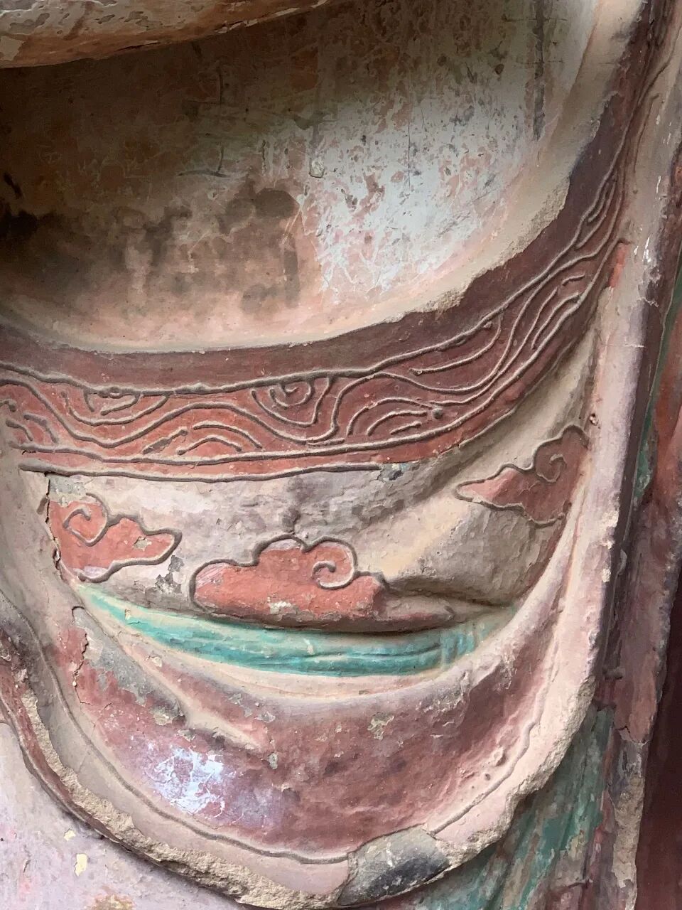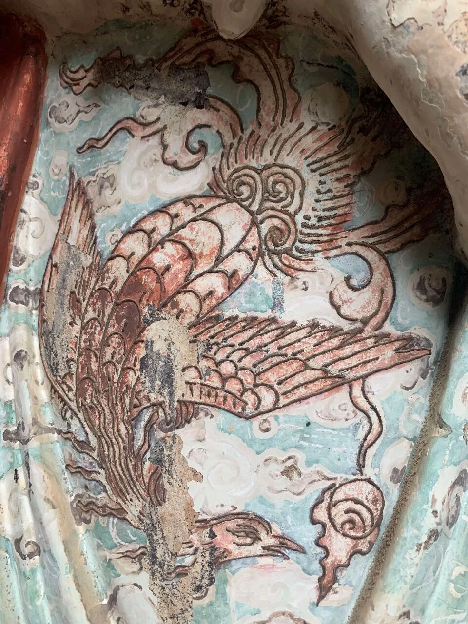 在明清时期信众用此法对塑像进行重新妆彩,普遍运用在塑像衣着上的龙、凤、花卉等各种图案,线条细密、流畅自如,装饰效果极强。