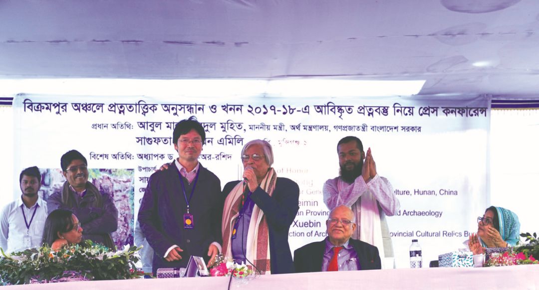 ▲2018年1月6日,在考古发现新闻发布会上,阿哥拉萨-毗诃罗普尔基金会主席努尔列林博士感谢中国考古工作者为孟加拉国文化遗产事业所作的贡献