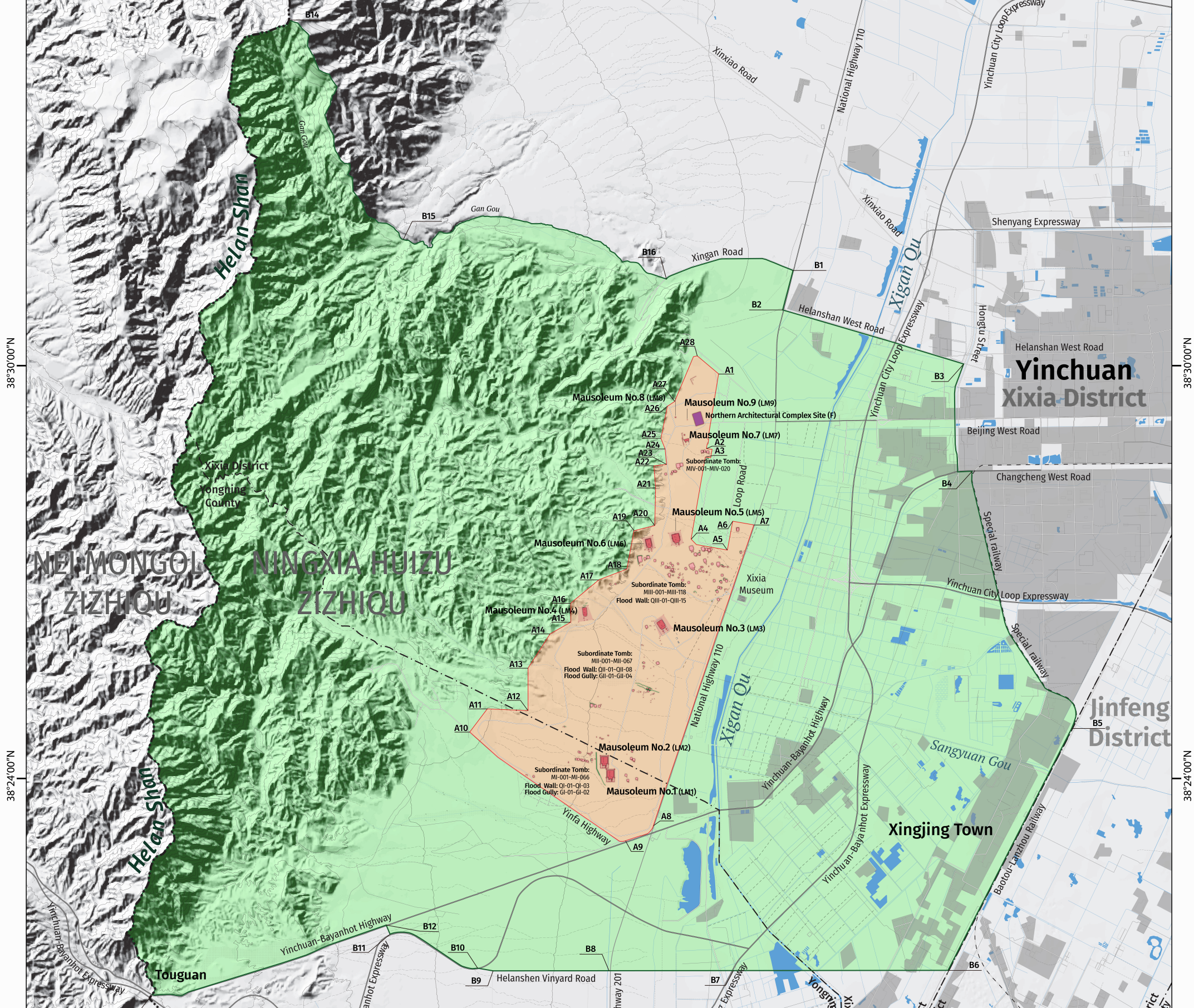 西夏王陵位于宁夏回族自治区银川市西部30公里的贺兰山东麓,陵区北起泉齐沟,南至银巴公路,南北长约10公里;东临西干渠,西靠贺兰山,东西宽约5公里,总占地面积约为50平方公里。陵区位于贺兰山中段南段东侧,为山前洪积扇地带,海拔1150-1220米。地表遍布砾石和粗砂,地基承重力大,保水性差,自然排水条件好。良好的地基使西夏王陵成功渡过了西北地区历史上的多场大地震。陵园所处位置常年降水量偏少,山洪暴发的可能性很低,利于陵园的整体保护。 [3] 初建时每个陵园均有地下陵寝、墓室、地面建筑和园林,独立占地都在10万平方米左右,形制与布局大体相同。 西夏陵是我国西北地区由党项族建立的西夏王朝(1038-1227)的帝王陵墓遗址群,位于贺兰山山脉南段东麓,隶属宁夏回族自治区银川市。遗产区面积38.99平方公里,缓冲区面积405.695平方公里,总面积达到了惊人的444.685平方公里,是银川市建成区面积(2024年末数据为198.34平方公里)的2倍有余。 遗产构成要素包括4种类型的人工建造活动遗址——9座帝陵、271处陪葬墓、5.03万平方米的陵区北端建筑遗址和32处防洪工程遗址(26处防洪墙及6条排洪沟)等,包括了陵区出土的7000多件馆藏文物与遗址上的大量建筑构件残件(各类建筑材料和构件、石刻、泥塑、壁画残块、马具和武器、器皿、动物形器、服饰及配件、钱币、工具、人骨、动物骨和食物遗存等,主要保存在西夏陵博物馆、宁夏文物考古研究所和宁夏博物馆),包括了具有重要自然地理分界作用的贺兰山山体及山前洪积扇地貌景观。这些风格独特的人工建造遗存与峰峦叠嶂的贺兰山势共同形成了雄伟壮丽的陵区景观。 突出普遍价值(OUV) 贺兰山下的西夏陵是西夏时期留存至今规模最大、等级最高、保存完整的考古遗存,可直接为中国历史上党项族创立并延续近200年的西夏王朝及其君主世系提供不可替代的特殊见证,揭示了公元11-13世纪西夏在“丝绸之路”上的中继枢纽地位。与此同时,西夏陵在选址方位、空间布局、陵寝制度、陵墓建筑、建造技术、丧葬习俗等方面所体现的特征,充分展现了这一时期内蒙古高原与青藏高原之间,以宁夏平原为中心,基于不同民族、不同生业、不同文化的相互交流而产生的广泛的文化融汇与创新特征。
