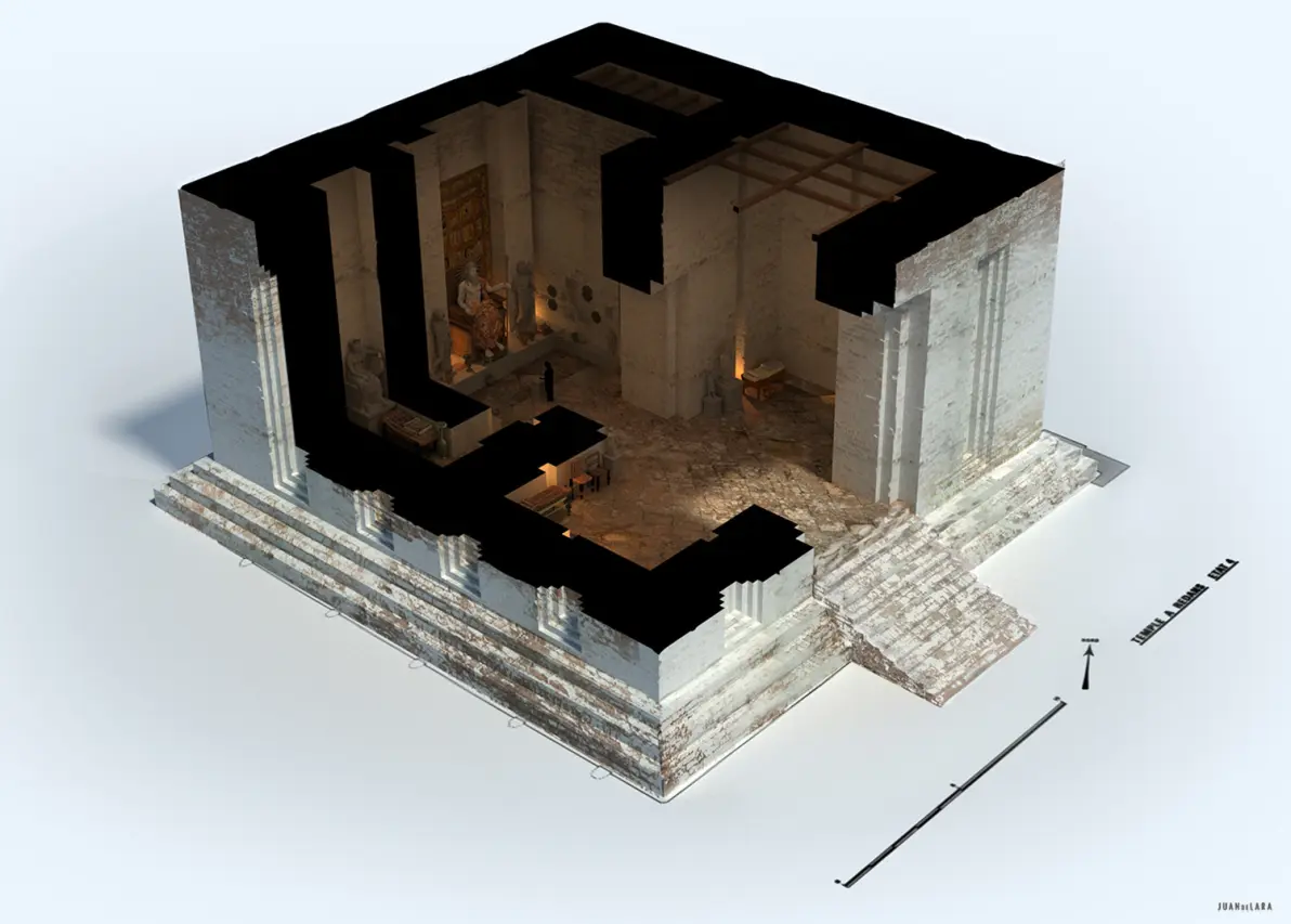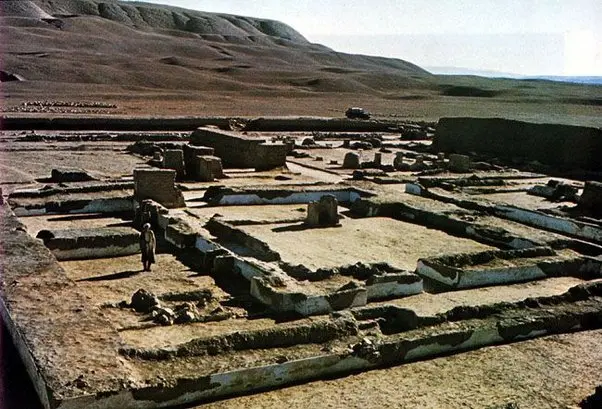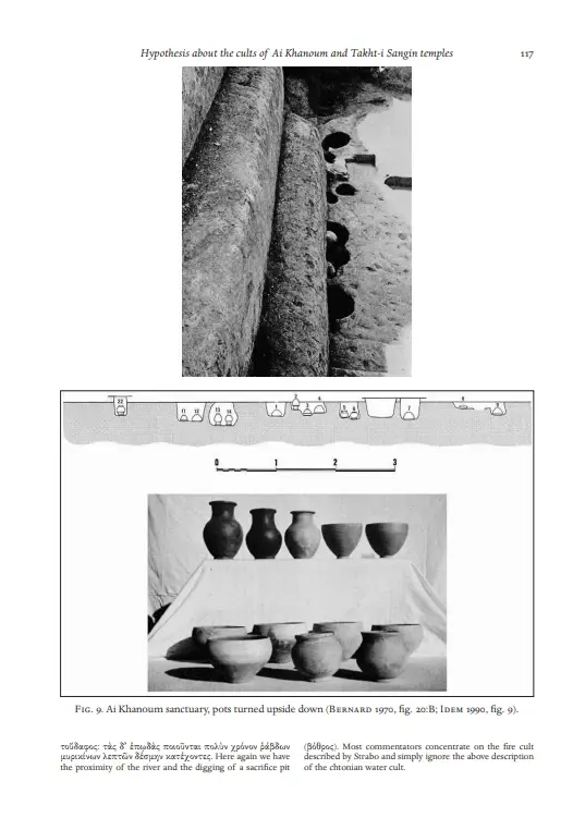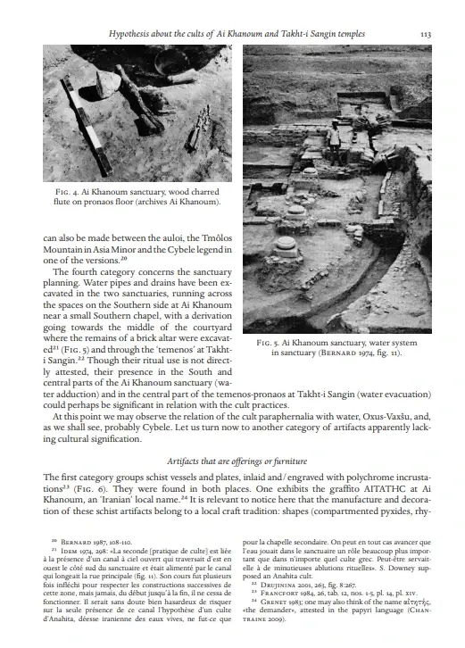 从发掘一开始,寺庙建筑中的波斯阿契美尼德元素就受到关注。识别性的“凹进壁龛”以及建筑物的三级平台是美索不达米亚建筑和后继风格的共同特征。寺庙里发现了许多文物,包括奠酒器皿(希腊和中亚宗教活动中常见的)、象牙家具和雕像、赤土陶器和一个奇异的奖章。