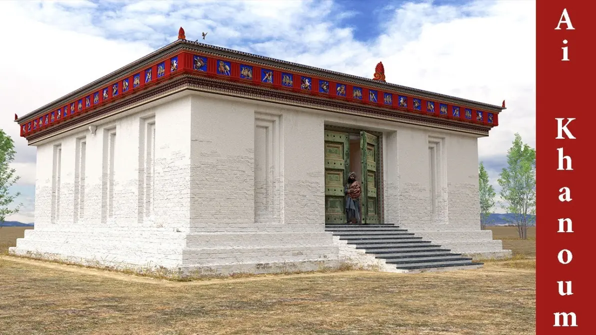 阿伊哈努姆考据建于公元前 300 年左右,由塞琉古主导-是希腊马其顿巴克特里亚地区城市的一部分。该地区曾经是波斯帝国的一部分,之后成为亚历山大帝国和塞琉古帝国的一部分,公元前 250 年左右成为一个独立的希腊-巴克特里亚国家。尽管是一座希腊化城市,阿伊哈努姆的建筑却有创新。主神庙被称为“带有壁龛的神庙”,在保罗·伯纳德 (Paul Bernard) 领导的发掘过程中发现,它并没有遵循人们熟悉的希腊模式。除了遮阳墙上可见的外部壁龛外,它还有一个平屋顶和平面图,更多地借鉴了中亚和美索不达米亚的建筑风格,而不是希腊世界的典型建筑风格。