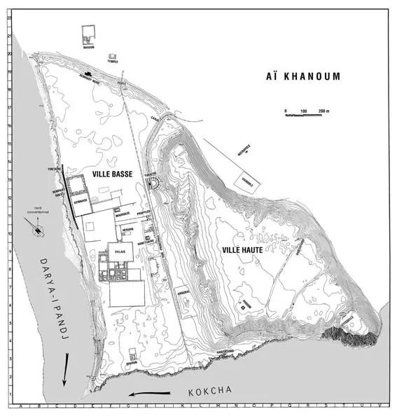 这座城市位于阿姆河(又名奥克苏斯河)和科克查河的交汇处,周围环绕着灌溉良好的农田,城市本身分为一个较低的城镇和一个 60 米高(200 英尺)的卫城。尽管阿伊-哈努姆并不位于主要贸易路线上,但它控制着兴都库什山脉的采矿通道和具有重要战略意义的咽喉要道。城市周围有大量的防御工事,并在百年间有不断的维护和改进。