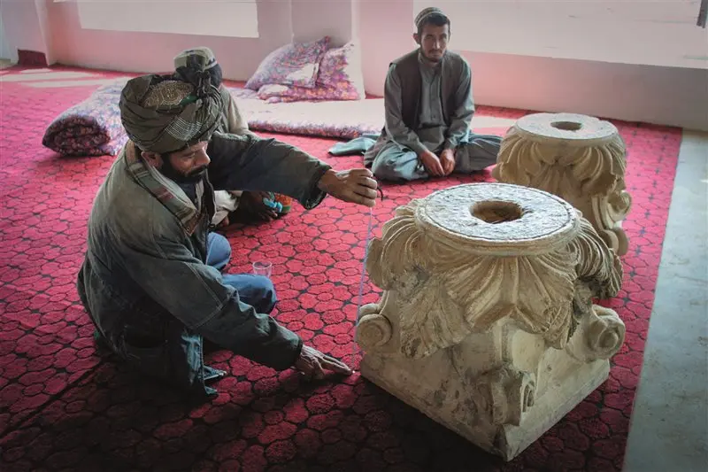 在霍贾·巴胡丁 (Khoja Bahoudin) 村,村民展示了找到的希腊式柱头