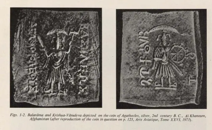 硬币描绘了 Vasudev Krishna 和 Samkarshana balarama。这些硬币对于巴拉茹阿玛和瓦苏代瓦·克里希纳崇拜的早期历史极其重要。 铭文写有古希腊文:国王 阿加索克勒斯 以及佉卢文rajane agathuklayasa 185-175 BC
