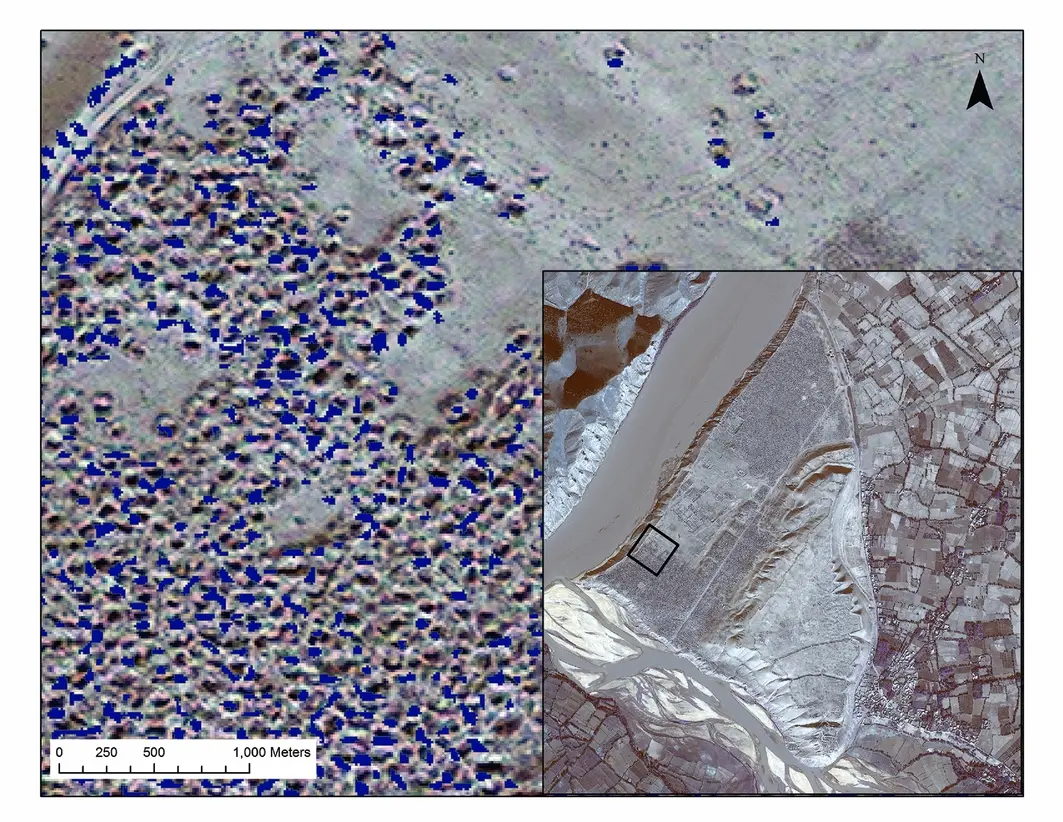 2010 年 11 月,阿伊哈努姆的抢劫坑数量为 21095 个。坑的总表面积估计为 149041m 2 ,约占该地点表面积的 17 %。从卫星图片上来看,似乎月球表面都要更为平整。插图:图中所示场地区域的位置。(WorldView-2,2010 年 11 月 8 日。)