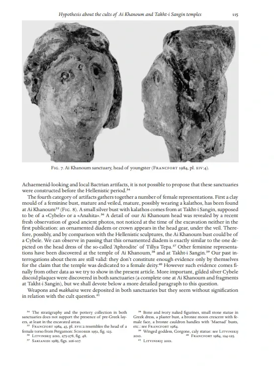 原本矗立在神庙中央的祭祀雕像残留的碎块表明,它是根据希腊传统雕刻而成的。左脚的一小部分幸存下来并显示出雷电,这是宙斯的常见图案。基于希腊雕像与其所在的东方神庙之间明显的不和谐,学者们提出了宙斯与巴克特里亚神祇如阿胡拉·马自达、密特拉或代表阿姆苏斯的神祇的融合。雷电也被用作女神阿耳忒弥斯、雅典娜甚至西布莉的属性;它甚至可能纯粹是象征性的。