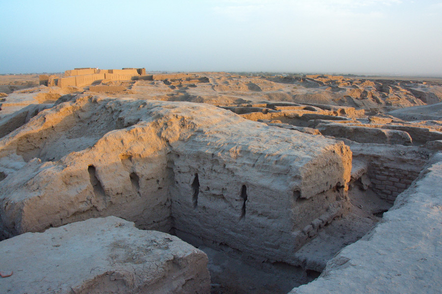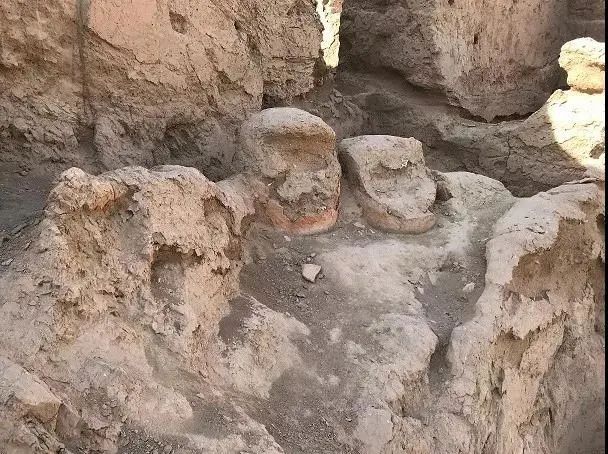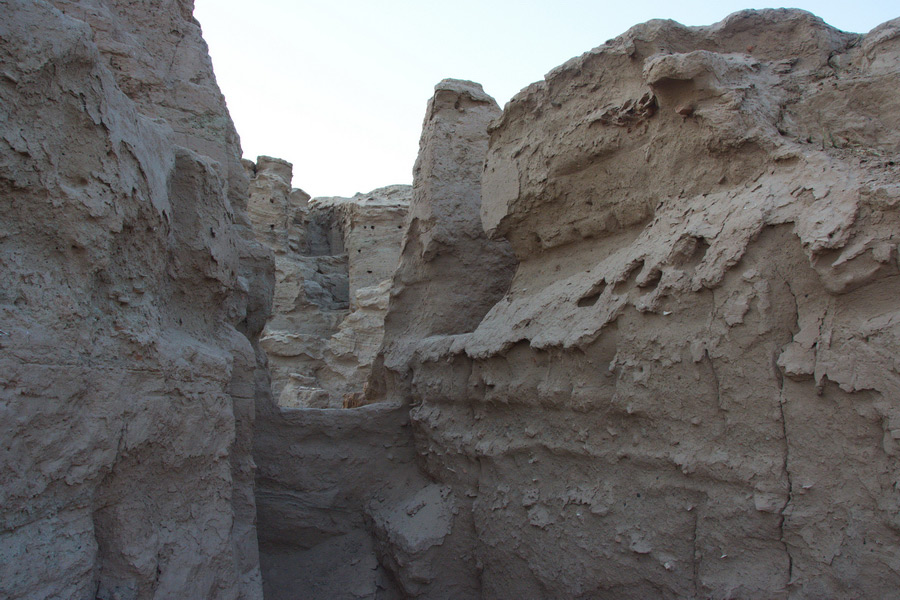 我们在铁尔梅兹的第四天,来到卡姆皮尔秋别。第一眼就被那复原后的北城墙所震撼,城墙上多至两排的、贵霜特有的箭簇形窗户(或射击孔)给人深刻印象。进入城墙,烈日下难分形状的黄土建筑,干燥又寂静的远近地貌,满地码放、用以复原古城的新造土砖,让人很难想象这里曾是古代巴克特里亚地区最繁荣、最古老的渡口。古城遗址由城区、城堡、城外居民区、墓葬区和宗教祭祀区组成。我们在城堡区坍塌叠压的断裂带,看到许多深埋入土的巨大陶瓮。这种大陶瓮在某些大概是库房的房间整齐排列,不知道用以盛葡萄酒还是盛谷物。