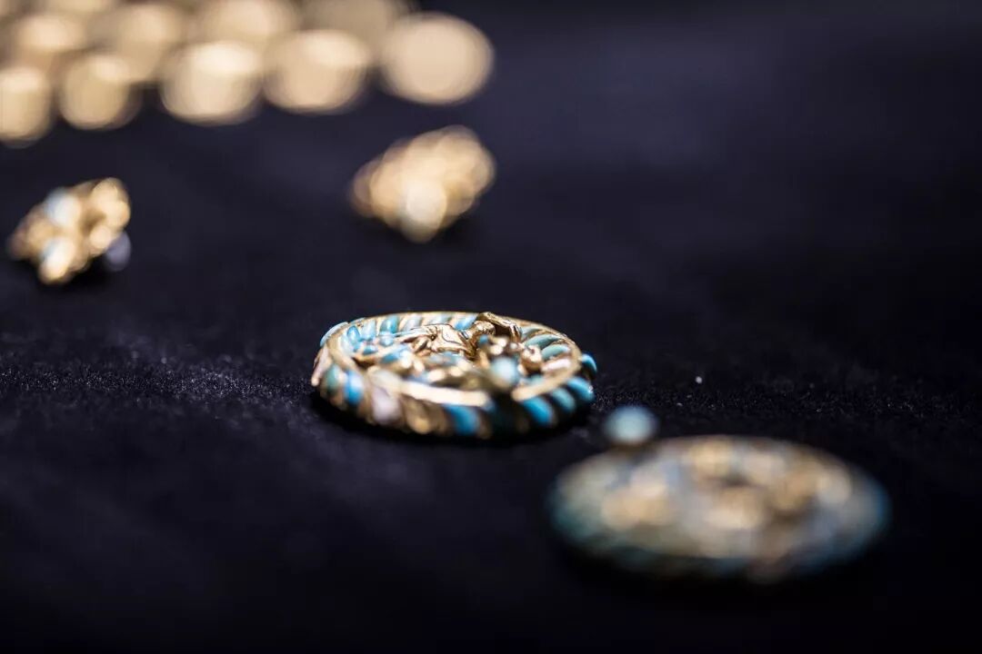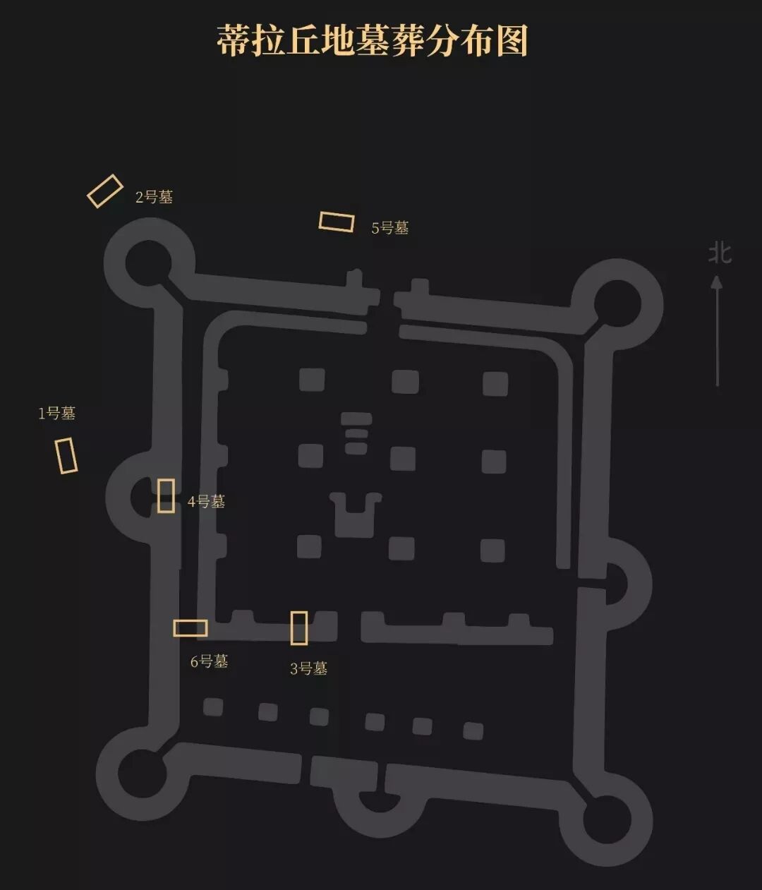 位于阿富汗北部朱兹詹省席巴尔甘地区的蒂拉丘地遗址,其字面意思是金色的丘地或土墩,因此又被称为“黄金之丘”,它直径约100米、标高约3米,原本是一座青铜时代的拜火教神坛,后被利用为墓地。1978年,由苏联和阿富汗组成的联合考古队在此地发掘了6座竖穴土坑墓(1男5女),出土了约21,618件金、银、铜、宝石、象牙等各种材质制作精美的文物。