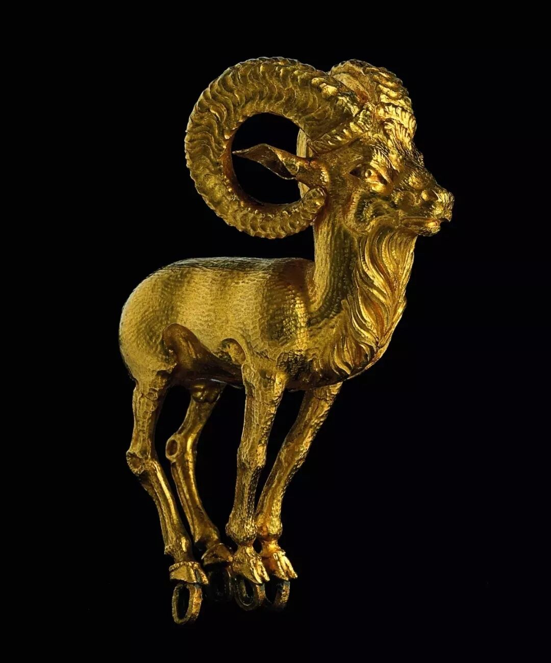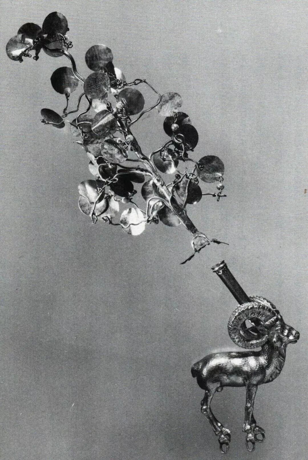 墓主头顶部位,则出土了金盘羊和树形步摇。大角盘羊是欧亚草原地带比较常见的被崇拜对象;步摇,上有垂珠,取其行步则动摇,故名,此种树形步摇,只在欧亚草原的高等级墓葬中有所发现,毫无疑问是墓主特殊身份的体现。值得注意的是,步摇的树干是中空的,与金盘羊头顶两角间的插管当是可以通过小圆竿插连的。
