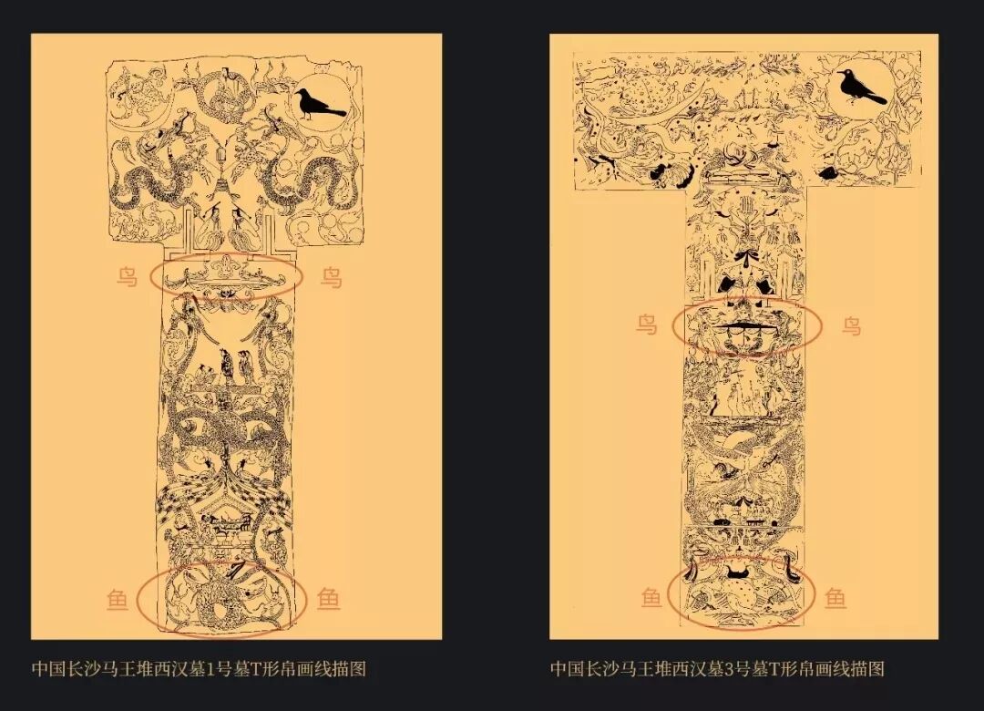 饰牌的画面结构,可能表现了世界的基本模式:上方是鸟,象征天上;中间是神或人;下方是鱼,象征地下。有意思的是,闻名于世的中国长沙公元前2世纪西汉马王堆墓中出土的T字帛画上,有着与之惊人一致的画面结构——最下面是两条相交的鱼,中间是人物和龙,天上则是鸟。这种相似性,当不能仅仅用巧合来解释。