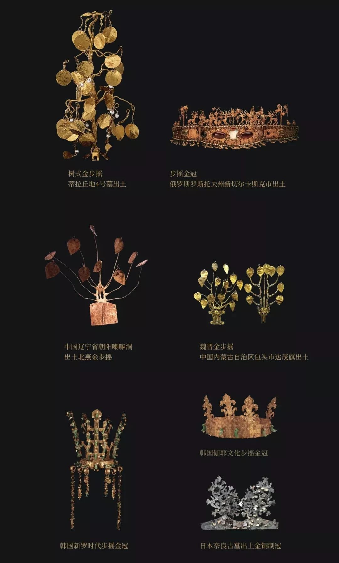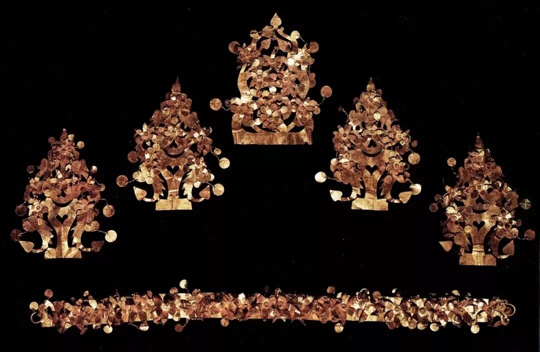最神奇的,是6号墓出土的华丽王冠。总体是由6个组件组成的,即一条用以围合成王冠底沿的细长带状饰和5个片状的镂空花形树,可以拆卸,也便于安装(背后各粘焊有多个小圆柱,插入长金针以固定)——这可能是为了适应草原民族的移动性生活特征。而步摇作为一种王侯、贵族的头部装饰,在整个欧亚大陆广为传播。