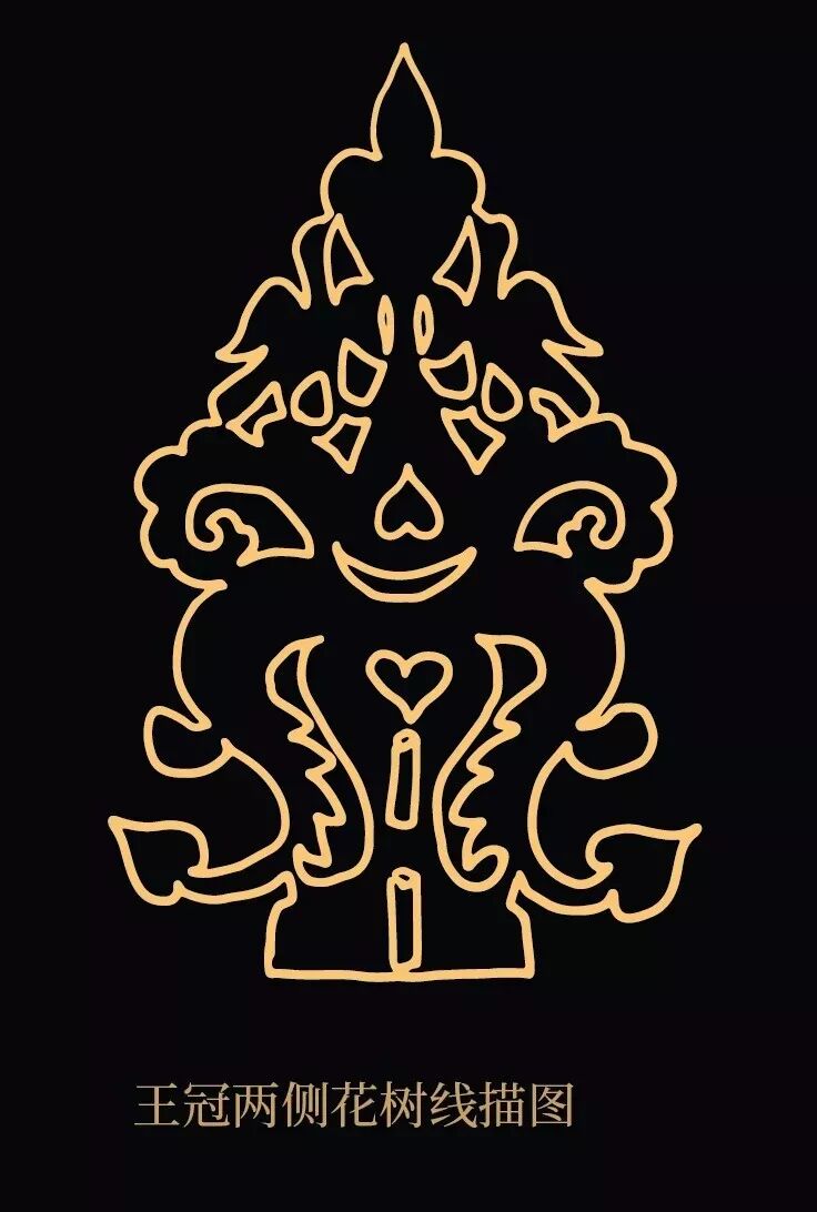 王冠每个组件上面,有规律地缀满了圆形薄金片和6叶形花饰。5个片状的花形树,中央的那片较宽,造型上呈现出一种对称的拱极形,尖部是心形,两侧如同两条头向下龙的剪影,底部中央的圆形内,是一个反旋的涡纹(这是一种常见的中国纹饰)。两侧的4片较窄,整体呈对称的宝瓶形造型,尖部是心形,两侧分别是一只鸟相向站在翻卷的纹饰上,最下面是龙尾的形状,中央是镂空的两个相背的心形中间夹着一个新月形。