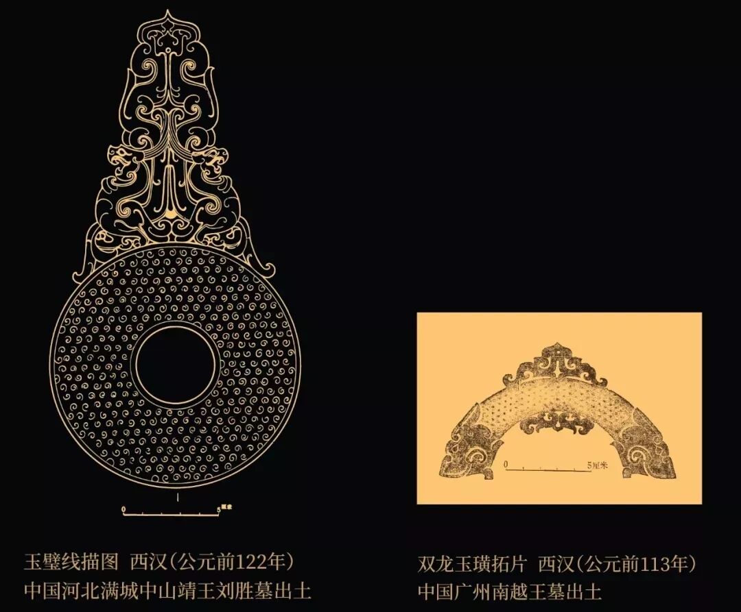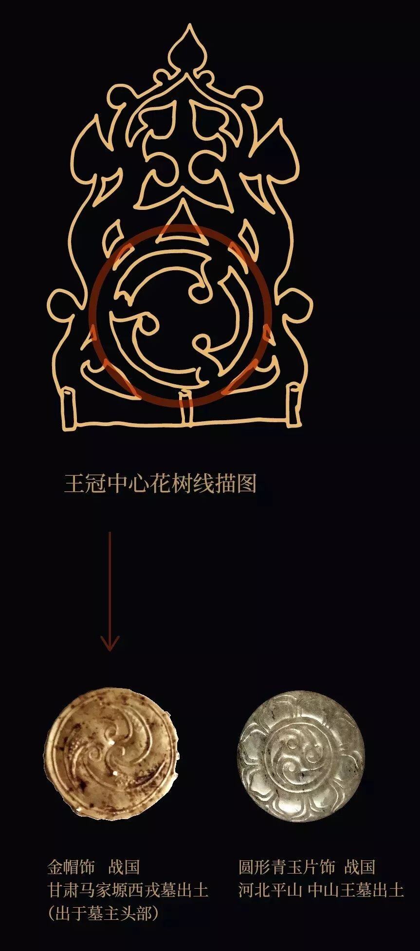 这种对称的拱极形,是早期中国十分常见的造型纹饰(象征上古以来中国人最崇尚的“北天极”,最典型如玉璧、玉璜等礼用玉器上对称的拱极形纹饰),加上反旋的涡形纹,表明这个王冠的设计结构可能受到了中国的影响。