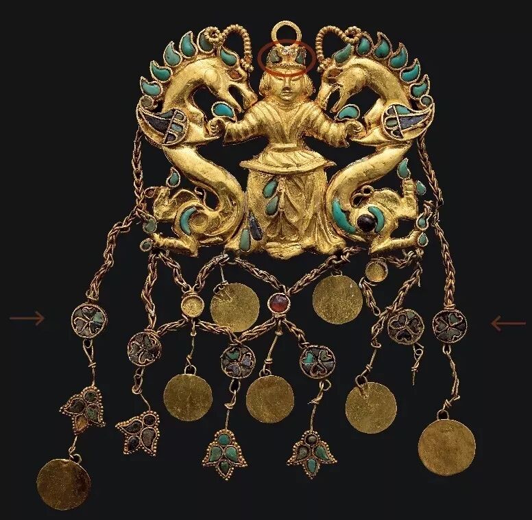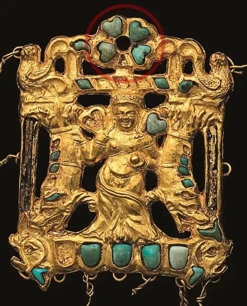 例如该墓出土的女神动物纹坠饰,大体上呈方框形,可按照3层画面内容来解读:1)方框底部两端各有一个鱼形动物的头部。2)方框中间一层,是主体画面:两边竖着的边框,如同立柱;柱旁是两条倒垂的狮首形动物,其身体就像向外弯曲的弧状圆柱,尾部则是3片茛苕叶形的装饰,如同科林斯柱头一样,这也许表现的是龙;正中间位置,则是一位女性特征非常明显的女神形象,她头戴王冠,面带微笑,肩部有两个镶嵌的心形绿松石,左手握着一个水果,右手扶在狮首形动物的身上。3)方框的上部,就像是一个花形拱门,中央是一个微高的花形镶嵌装饰,由4个心形和一个梯形绿松石构成的,两端的柱头,分别站立着两只鸟(鹰?枭?)。