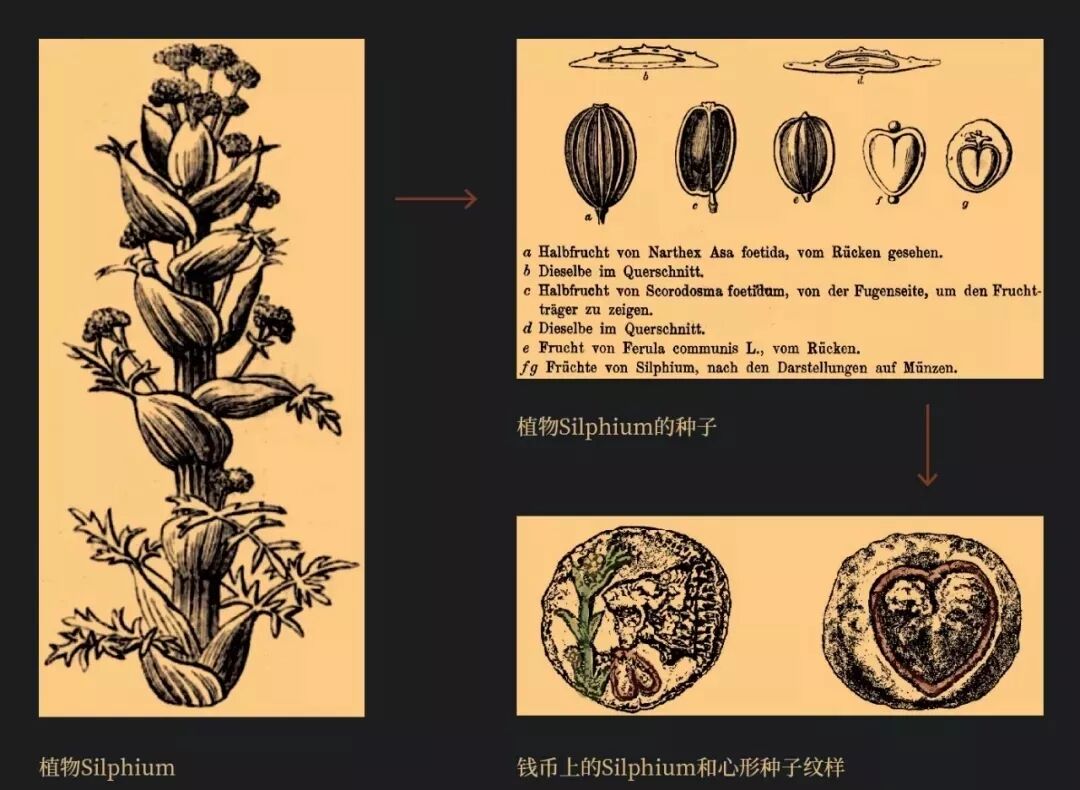 有学者认为,古希腊的心形纹饰可能起源于一种类似大茴香的植物Silphium的心形种子,而这种植物拥有神秘的超能量,其竿中空有节,就像竹子一样,常常被用作希腊神灵的权杖。这种植物和它的心形种子还被希腊人印在钱币的正反面。