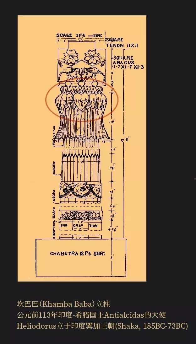 公元前113年,塔克西拉(Taxila)的印度-希腊国王安蒂尔西达斯(Antialcidas)派里奥多罗斯(Heliodorus)出使印度的巽加王朝(Shaka,公元前185年-公元前73年),为表纪念,立了一根柱子,柱头即有一圈颇具象征意味的心形。