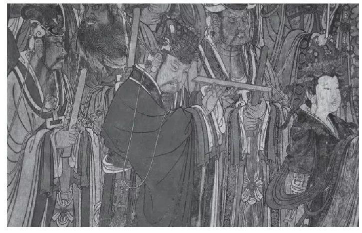 例如《朝元图》中很多线条笔法流畅圆转,提按转折,刚柔强弱,气力笔速都源于“书画同源”“骨法用笔”的审美精神。《朝元图》中不仅对人物线条的描绘十分讲究,在对衣服的用线变化上也十分考究,对衣服装饰纹样、周边事物的刻画也存在不同的线条变化,用书写的方法来描绘衣服上的祥云等图样来区分人物轮廓的长线条,使人物塑造更加完整而整体,也不会喧宾夺主,用夸张的表现方法来描绘帝王,使其形象威严而具有张力,图中人物众多,作者运用线条的特性来表现人物,既复杂繁复又井然有序,通过人物的简洁以及物品的点缀细节的刻画让画面更为完整且具美感,也使得画面饱满有深度,更值得探究,也更耐人寻味。