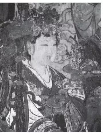 壁画神像衣纹多用“兰叶描”,特点是用力不均等,在运笔过程中有提有按,每一根线条都是虚入虚出,提案相乘,线条变化丰富多样,使得神像更加生动,形象更具有立体感。永乐宫壁画的线描继承了“吴带当风”的遒劲有力,波动起落。在人像众多、线条较长的壮观宏大的场景中,画面中的线条很难一笔勾勒完整,于是运用接笔法,在线条的描绘中无缝连接、流畅轻盈,似有一气呵成的感觉,而线条的描绘过程则另有玄妙,例如《朝元图·举笏太乙》(图1),蓝衣太乙的形象用寥寥几笔舒展流畅的长线条勾勒出身形动态,使得画像既具体又简单明了,又有随风波动仙气萦绕的飘逸之感,充分体现出线条的形式美、韵律美。根据人物以及衣饰的不同特点,来控制线描的粗细,在《朝元图·奉宝玉女》中(图2),玉女皮肤光滑细嫩,脸部线条的勾勒要更细腻柔软,区别于男子众神的面部线条,利用兰叶描虚入虚出的线描特点,用线条的疏密、粗细、浓淡的线条区分皮肤的质地。描绘不同人物的毛发,王母的头发则是顺畅乌黑有力度的长线条,而宫女则是浅淡稀松的头发,画师通过对线条的运用来描绘出不同人物的形象和特点,塑造出了栩栩如生的诸位神像人物。