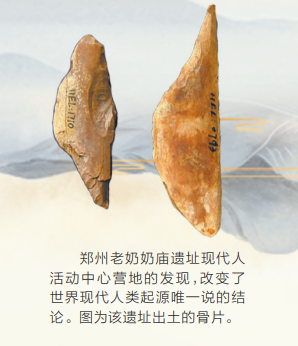 1978年,在南召发现了中更新世人类1颗牙齿化石。1979年,在卢氏发现了10万年前的人类4块头骨残片和2枚牙齿化石。2007年,在许昌灵井遗址发现了8万至10万年前的人类头盖骨化石。2012年,在栾川孙家洞又发现了中更新世人类6颗牙齿化石。这些发现为研究东亚古人类演化和中国现代人类起源提供了物证。此外,在三门峡水磨沟和会兴沟、洛阳北窑、荥阳织机洞、栾川七里坪、舞阳大岗等旧石器时期遗址中保存着丰富多彩的远古人类生活遗存,再现了远古人类生活、进化、发展、创业的场景。特别是郑州老奶奶庙遗址发现了3万至5万年前人类生活的中心营地,一层层居住面、一堆堆篝火和人们吃过丢弃的烧烤骨头,无可置疑地证实,中国现代人不是外来的,是这里土生土长的,推翻了中国人是从西方迁徙过来的观点。而新郑赵庄遗址完整保存着先民们进行祈祷的实物遗存,从远处搬来的石块和放置其上的大象头骨,传递着3万至5万年前人们的精神追求,清晰表明这时的中国先民已经完成了原始人向现代人的嬗变。