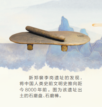 在农业方面,郑州老奶奶庙遗址发现了3万年前的稗的存在。新郑裴李岗遗址出土的磨制石铲、石锛、齿式石镰,特别是磨制的石磨盘、石磨棒以及窖藏粟,舞阳贾湖遗址窖穴中的水稻遗存等,标志早在8000年前中国原始农业已经形成。郑州大河村遗址发现的大豆、莲子等农作物种子,向我们展示了中国农耕文明发展的伟大进程。