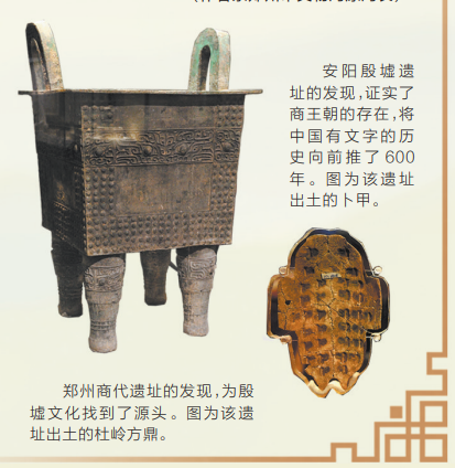 新郑李家楼郑公大墓及其郑韩故城的考古发掘,让人们第一次通过实物看到了《春秋》中描述的东周时代的恢弘社会。荥阳娘娘寨两周城池的发现,让人们第一次看到了西周时代的社会形象。安阳殷墟遗址的发现,让人们第一次看到了商王朝的真实存在。郑州商城遗址的发现,让人们第一次领略了殷墟文明的源头和滥觞。偃师二里头遗址的发现,让人们第一次看到夏王朝不是传说。登封王城岗遗址的发现,让人们第一次遥望了早期夏王朝的曙光。巩义双槐树遗址的发现,让人们第一次感受中华文明诞生前夜的涅槃璀璨。渑池仰韶村遗址的发现,让人们第一次惊叹中华民族开始迈向文明的精彩气象。新郑裴李岗遗址的发现,让人们第一次认识到中国史前文明史比仰韶文化还要早两千年。新密李家沟遗址的发现,让人们第一次读到了中原地区由旧石器时代迈向新石器时代的豪迈篇章。郑州老奶奶庙遗址的发现,让人们第一次认识到东亚现代人的独立源起。灵井“许昌人”遗址的发现,为人们再现了中国古人类向现代人进化步履的铿锵。