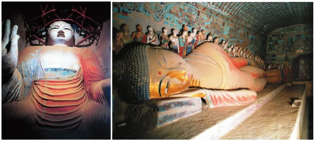 在敦煌石窟中,莫高窟第96窟北大像、第130窟南大像、第148窟涅槃像、第159窟涅槃像、第332窟涅槃像以及榆林窟第6窟的弥勒像等都是运用石胎泥塑的方式塑造。