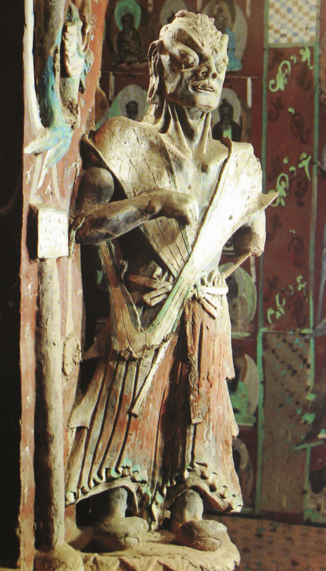 敦煌石窟中最早出现力士像是在北魏第435窟中,其中心塔柱东向面南北两侧各存一身。北侧一身,高0.94米,棱角分明,眉骨高调,眼睛上斜,眼球鼓出;大蒜鼻,鼻孔粗大,嘴巴张开,牙齿稀松,有的已经脱落;脸部两颊塌陷,下巴尖削,脖颈粗壮,喉结粗大,青筋暴露。整个面相较为丑陋,甚至有些狰狞恐怖。