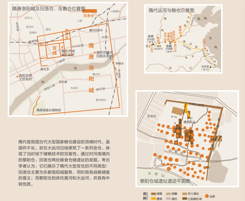 隋代是我国古代大型国家粮仓建设的顶峰时代,虽国祚不长,却在大运河沿线修筑了一系列官仓,体现了当时地下储粮技术的完备性。通过对河南境内的黎阳仓、回洛仓两处粮食仓储遗址的发掘,考古学者认为,它们展示了隋代大型官仓的不同类型::回洛仓主要为东都洛阳城服务,同时具有战略储备的意义;而黎阳仓则依托黄河和大运河,并具有中转性质