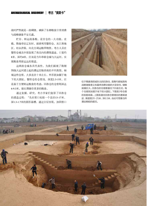 位于隋唐洛阳城东北的回洛仓,是隋代都城具有战略储备意义和最终消费功能的大型官仓,储粮规模巨大。回洛仓的仓窖数量在700座左右,每个仓窖犹如掘于地下的大圆缸。图为3号仓窖的发掘场景