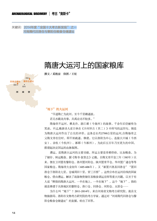 目前,大运河的部分航段尚在服役,每一个国人都知晓,它是中国历史上不亚于长城、故宫的杰作,但对其历史、科技、文化价值熟稔者,却仍不算多。2014年,“河南隋代回洛仓与黎阳仓粮食仓储遗址”入选“全国十大考古新发现” ,同年,包括“含嘉仓160号仓窖遗址”、“黎阳仓遗址”、“回洛仓遗址”等58处遗产点的“大运河”项目,加入了世界遗产的大家庭,于是,古人为确保国家粮食安全的努力,成为了全世界珍贵的遗产。