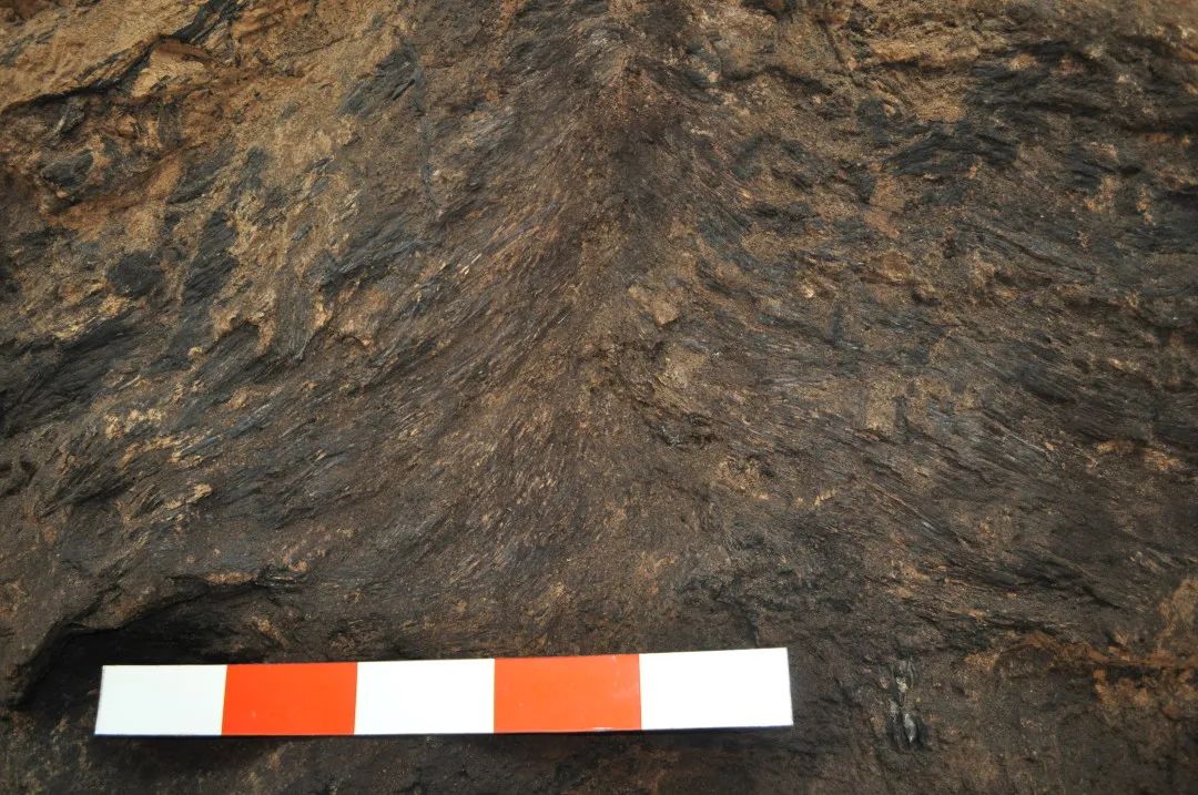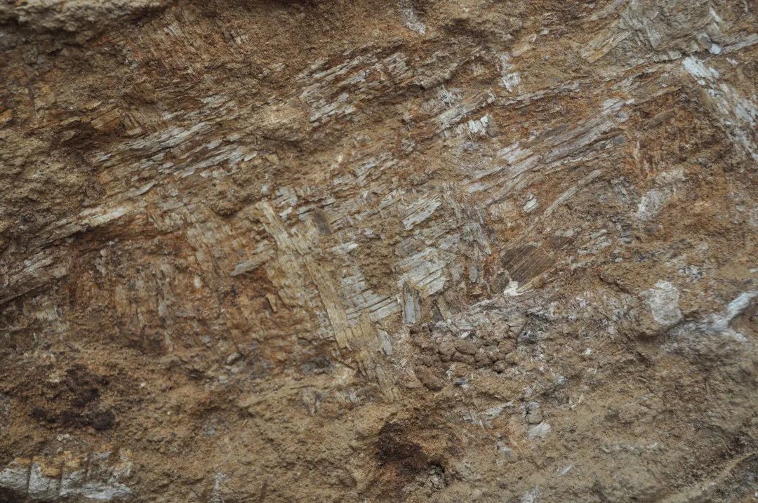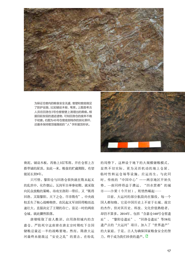 为保证仓窖内的粮食安全无虞,窖壁和窖底做足了防护设施,比如铺设木板、苇席。上图是考古人员在回洛仓3号仓窖窖壁上清理出的蓆痕。根据目前发现的遗迹遗物,可知回洛仓的废弃不晚于初唐。下图为46号仓窖底部残存的炭化草杆,还基本保持窖顶塌落前的“人”字形屋顶形状
