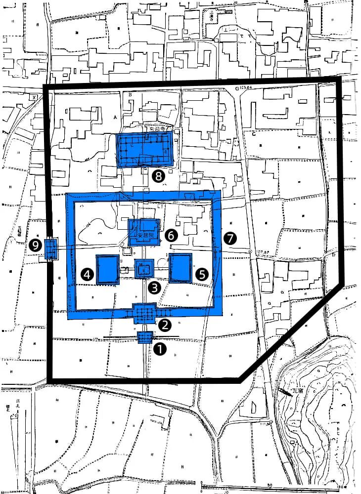 东限:在目前讲堂遗迹之北,发现了寺院北端一角的遗迹。通过此“角”大致划出延长线作为寺院东限。