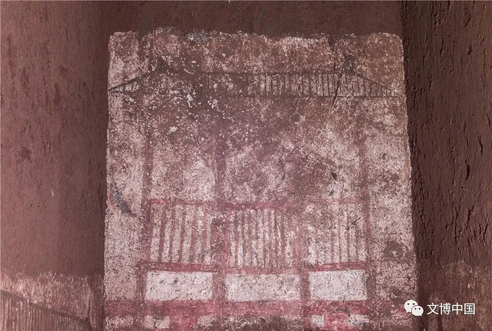 中兆村M100壁画主要分布于第二天井北壁、西壁、东壁底部。北壁封门上壁画内容为单体建筑;西壁壁画绘有房屋、立柱;东壁壁画内容与西壁壁画相似,仅屋脊南侧无鸱尾。前室北壁西侧,壁画绘出直棂窗,窗框内凹,棂条八根。