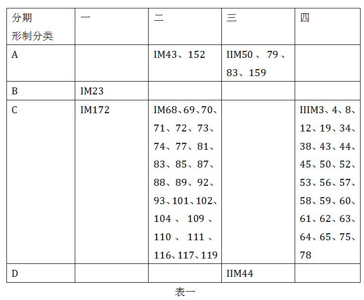 洋海墓地规模庞大,墓葬众多,所以分期是一项繁琐细致的工作。为此整理团队前后两次发表了分期成果。他们依据形制,将所有墓葬分为四类:A.椭圆形竖穴土坑墓;B.长方形竖穴二层台墓;C.长方形竖穴墓;D.竖穴偏室墓;不过,整理团队意识到墓葬形制分类不能作为分期的唯一依据,需要结合器物形制和组合。在2011年发表的报告中他们分为三期,但是当时碳十四年代只有9个。 本报告分为四期,不仅收入了所有墓葬材料,而且增加了许多碳十四年代,达46个。但是,笔者整理了本报告提供的墓葬形制分类和分期,发现了不少错乱现象(表一)。第一期的墓葬中,除了对应本期的A型,还有1座B型,还有1座C型(IM172);在第二期的墓葬中,除了对应本期的B型,还有25座C型,还有2座A型(IM43、152);在第三期的墓葬中,除了对应本期的C型,有4座A型墓(IIM50、79、83、159),还有1座D型(IIM44);在第四期的墓葬中,除了对应本期的D型,还有25座C型墓。由于墓葬数量众多,而且有些墓葬中陶器较少,报告中存在上述错乱现象不足为奇。他们继而利用测得的碳十四年代,将四期的年代定为:一期,公元前13-前11世纪;二期,公元前10-前8世纪;三期,公元前7-4世纪;四期,公元前3世纪-公元2世纪。