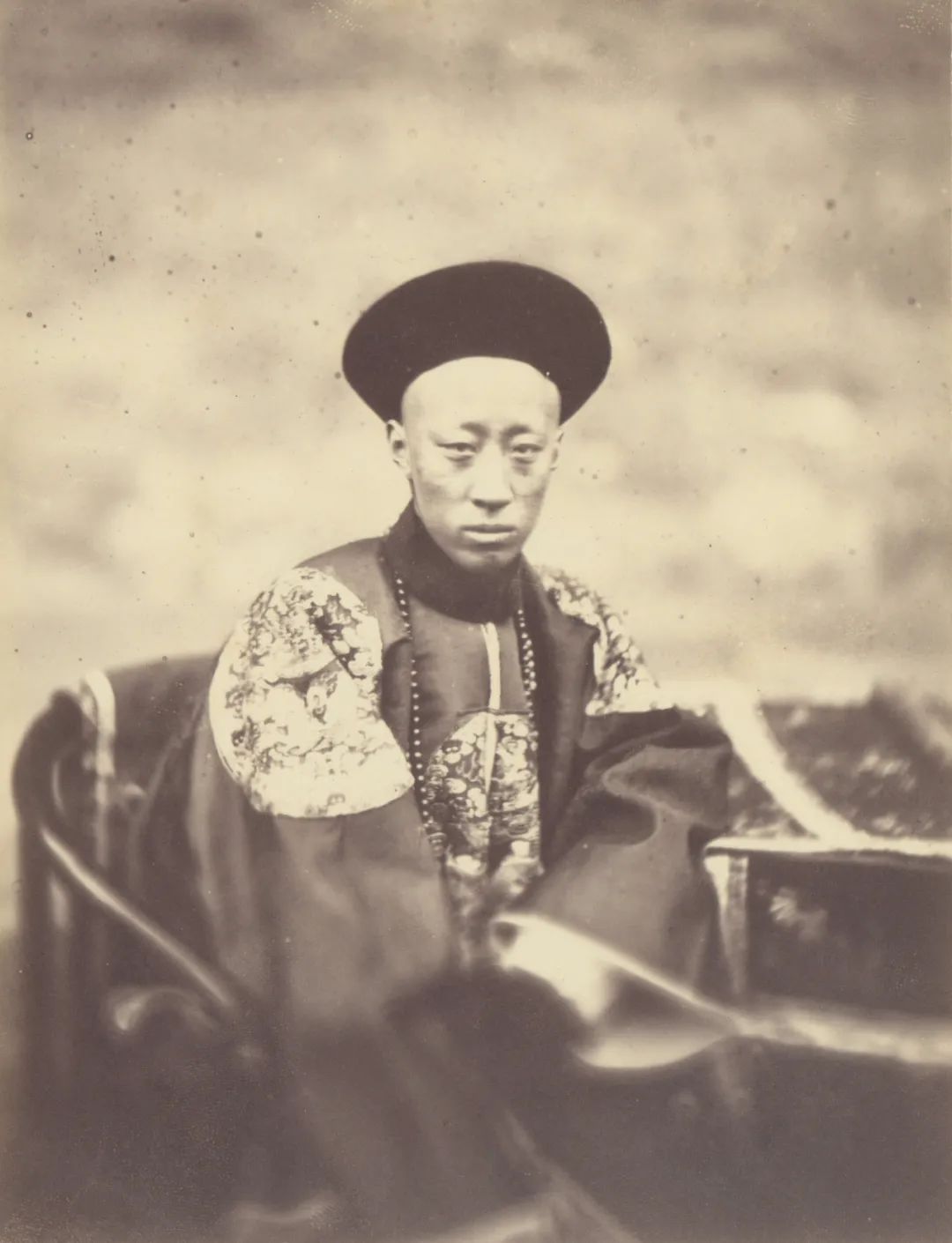 11月2日,恭亲王回访额尔金,费利斯・比托再次抓住时机,在额尔金勋爵的住处给恭亲王奕䜣补拍了一张肖像照片。据英军军医芮尼的描述:恭亲王那天身穿一件紫色绣有黄龙的锦缎官袍……他戴着一顶边缘上翘的官帽,除了在顶戴处有一个红绸做成的旋钮之外,并无其他任何装饰。这张照片拍摄得非常成功,此后被多次使用,成为恭亲王的标准像。从比托留下的影像中我们看到,恭亲王面容清耀,表情肃穆,双眉紧锁,悲凉而忧郁。这是目前我们可知的最早的皇室成员的照片,为研究政治史和摄影史提供了可靠的影像资料。